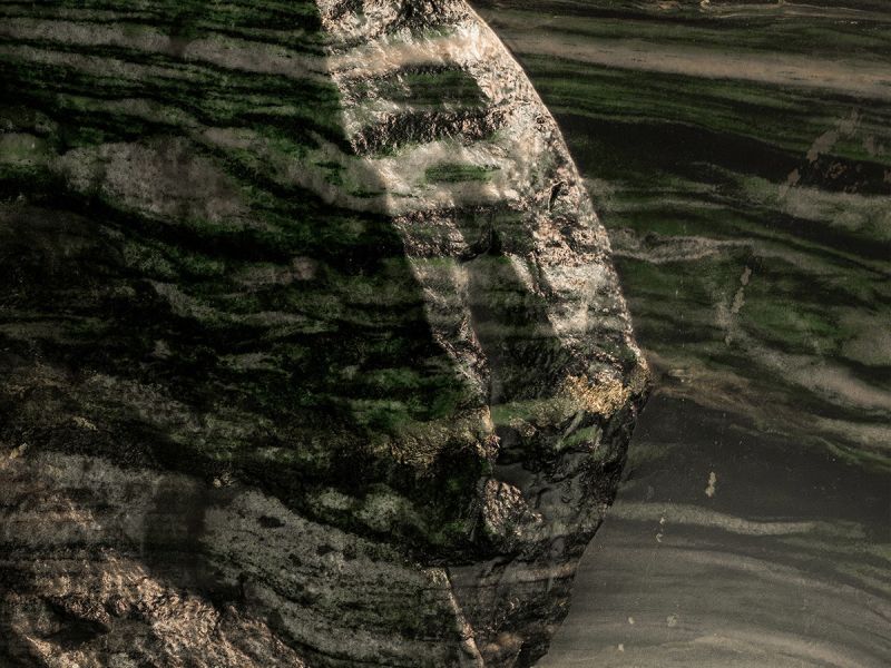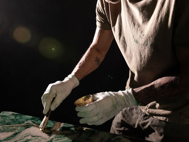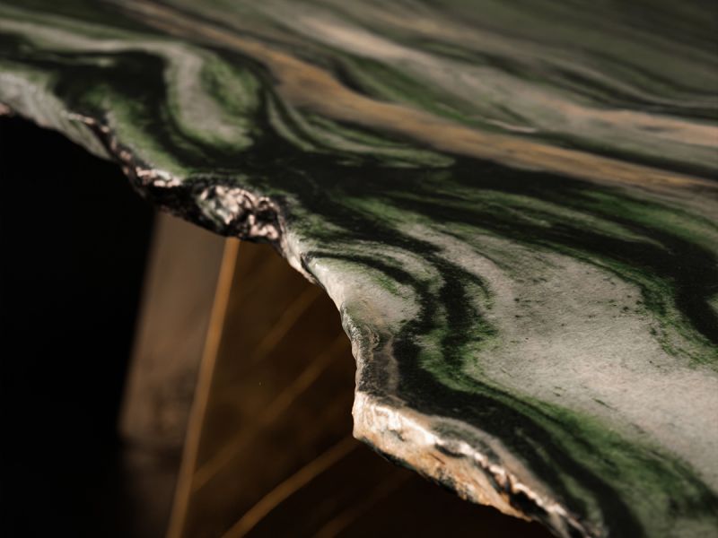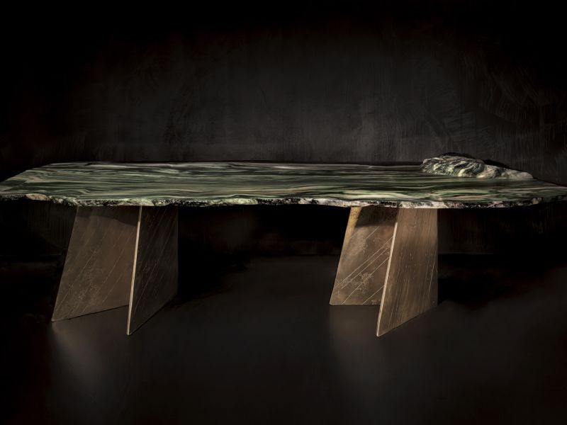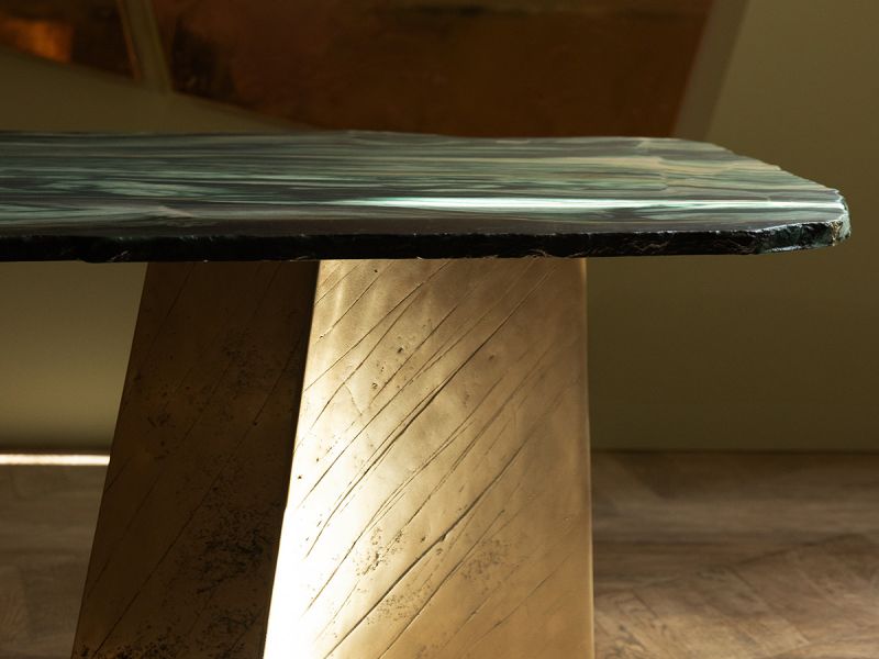 Vision: a one-of-a-kind dining table, revisiting a slab of Lapponia marble in an extraordinarily unique way. Its sinuous yet angular shape, with a soft matte finish, makes this table functional, allowing you to eat and drink on it. Its legs are crafted from cast brass, hand-scratched by the artist during the creation process.