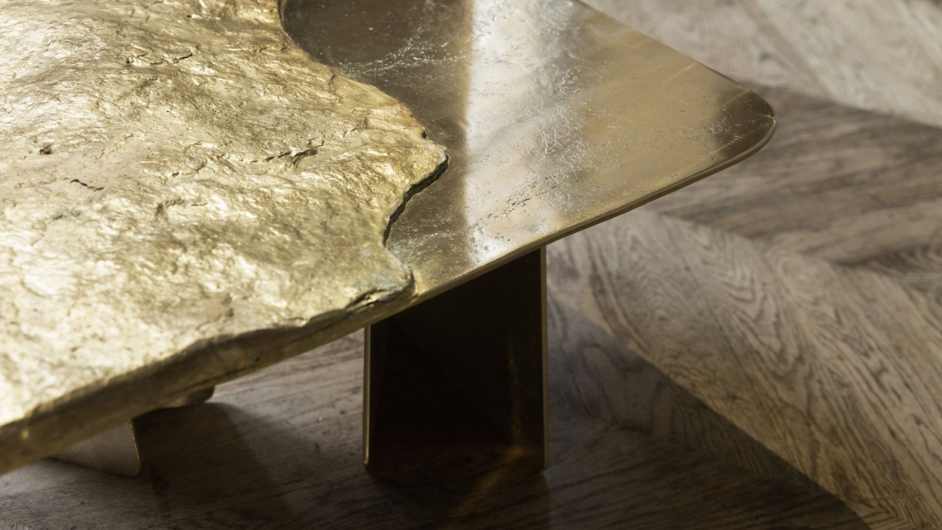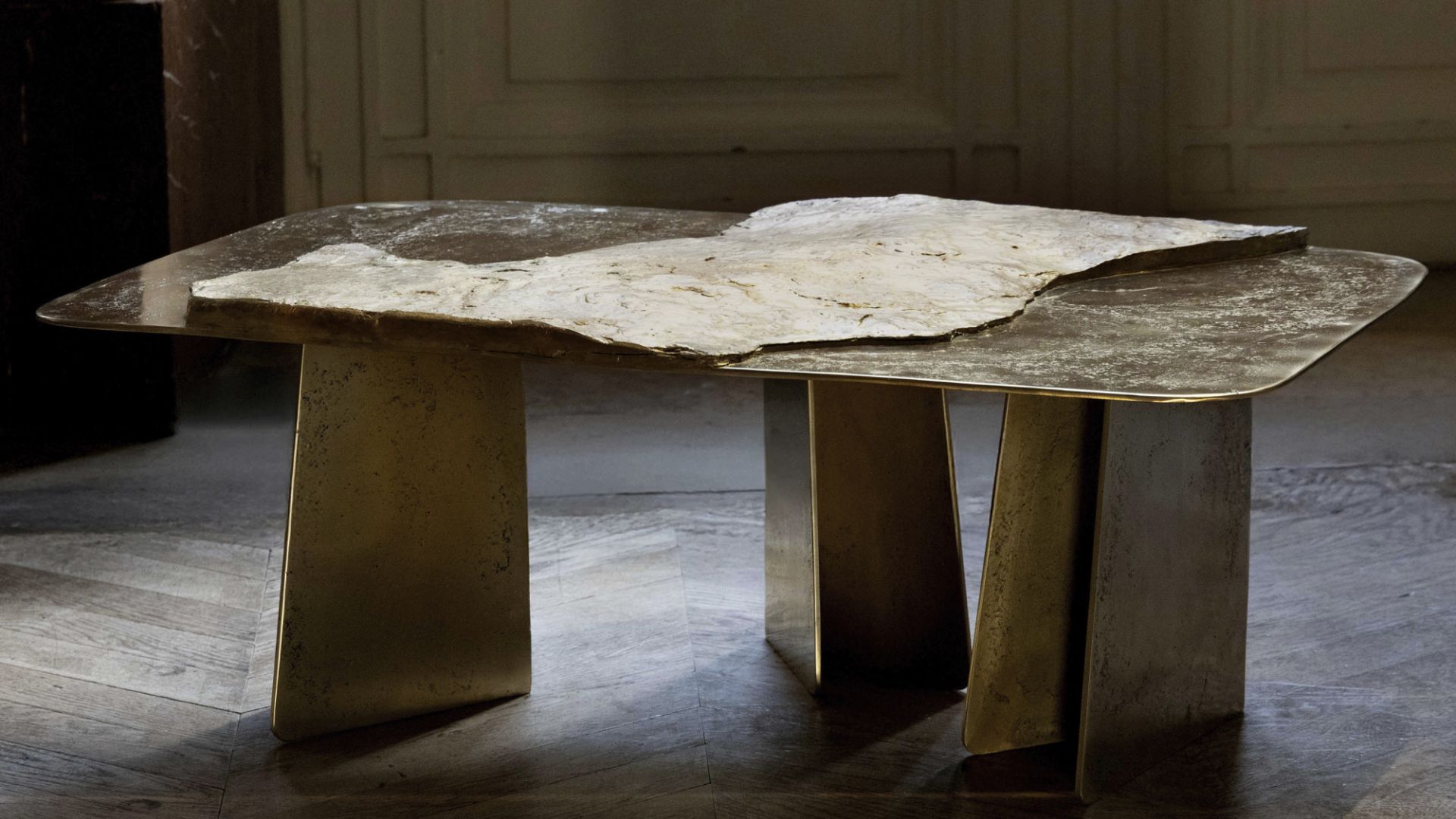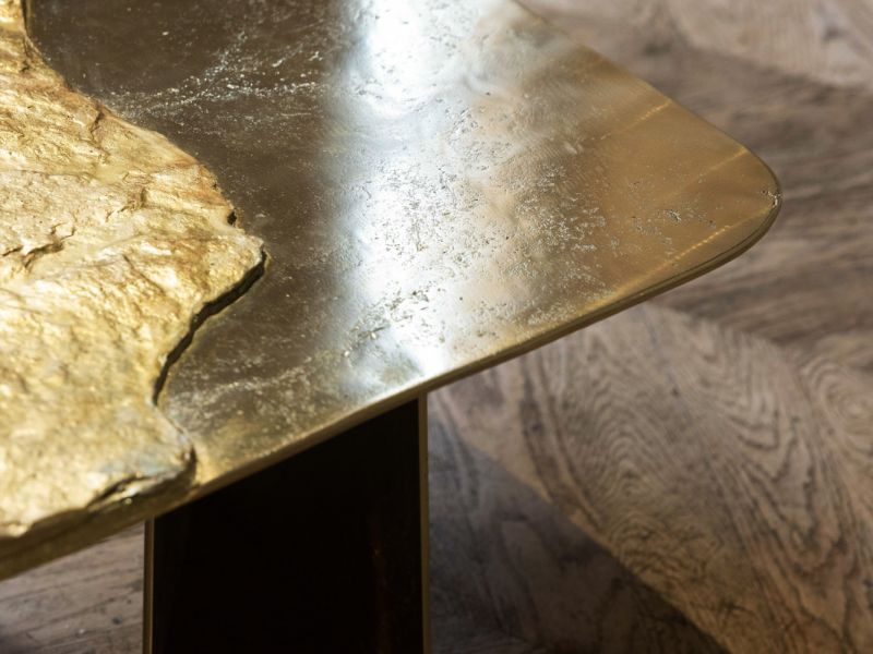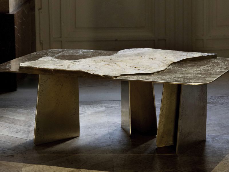 Vision: a one-of-a-kind coffee table, inspired by the distinctive shapes of the famous archaeological site. A combination of a solid, heavy frame supported by sinuous, rounded legs and a slab of acid-etched travertine marble. This small table is a work of art, all crafted from cast brass.