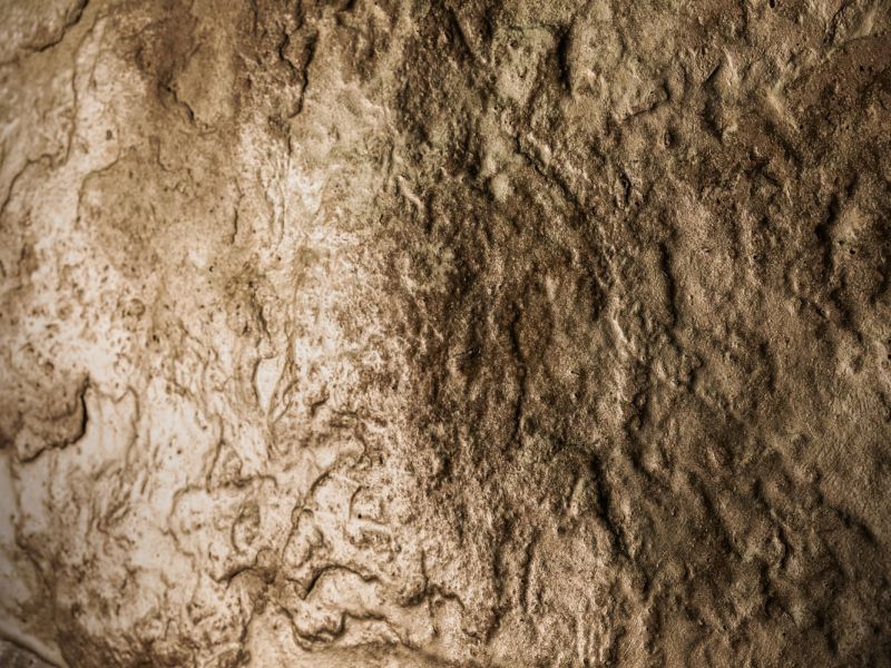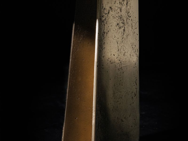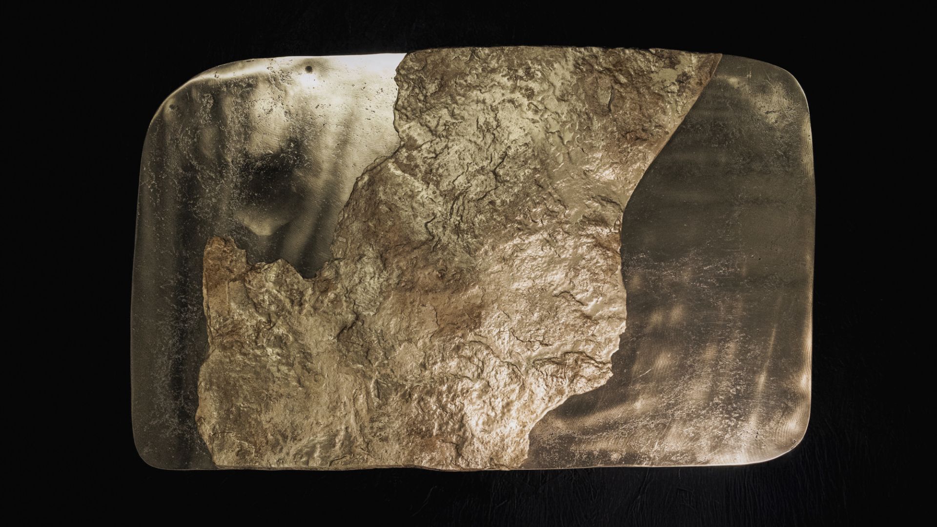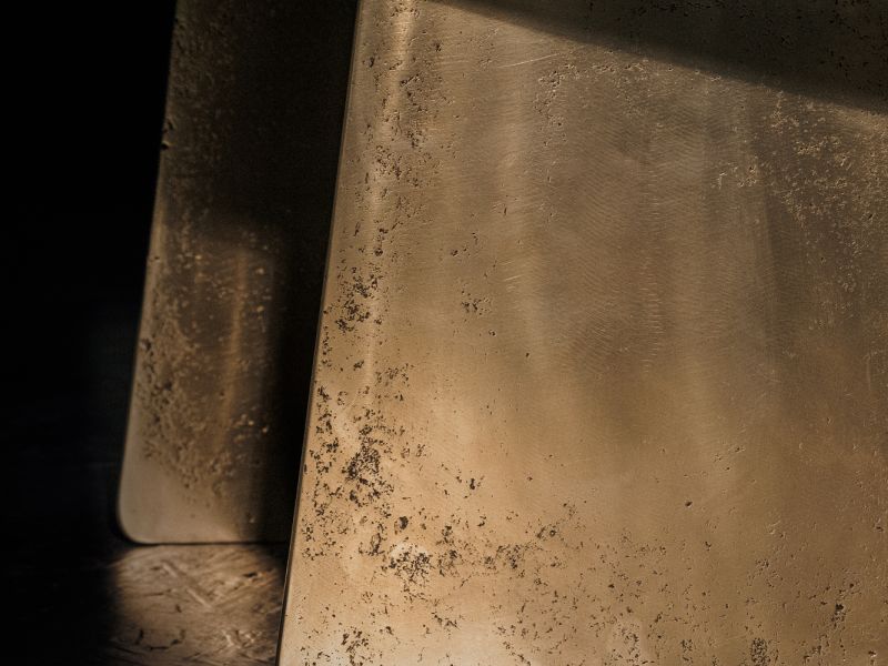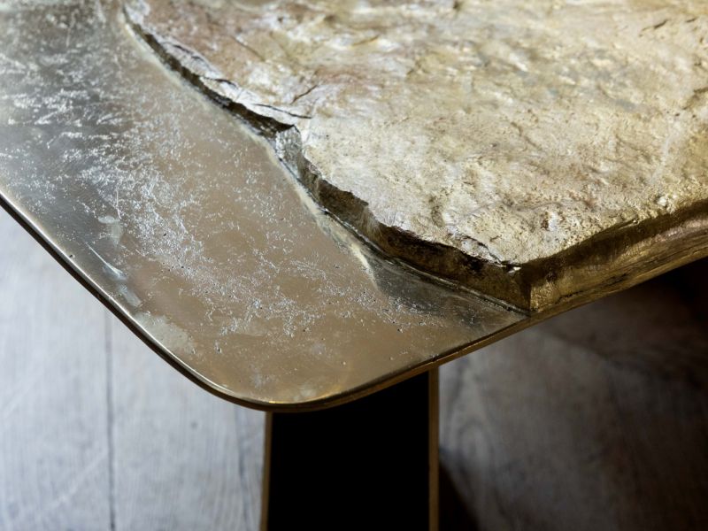 Vision: a one-of-a-kind coffee table, inspired by the distinctive shapes of the famous archaeological site. A combination of a solid, heavy frame supported by sinuous, rounded legs and a slab of acid-etched travertine marble. This small table is a work of art, all crafted from cast brass.