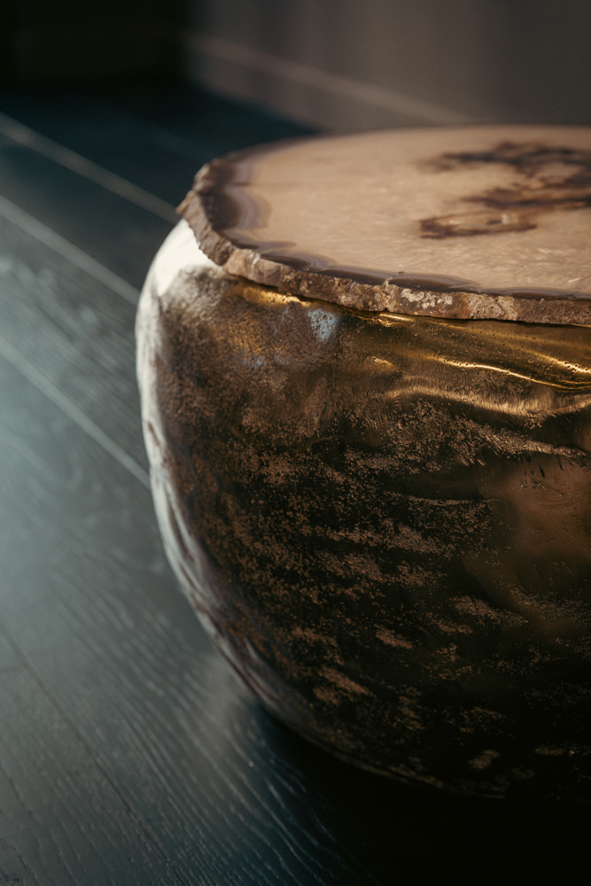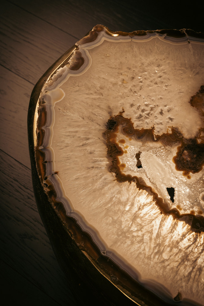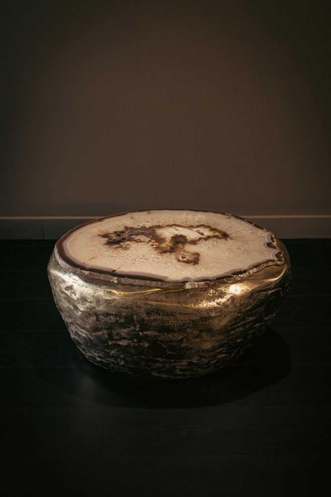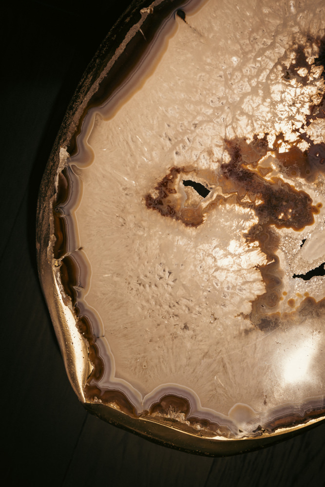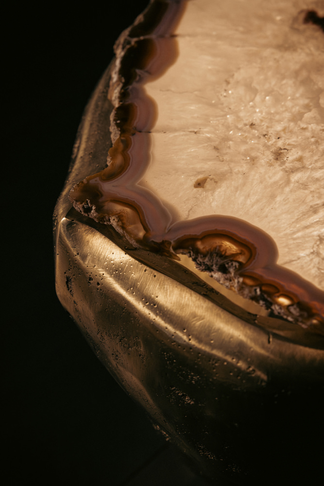 a one-of-a-kind coffee table born from the idea of recreating a real geode, handmade from cast brass. It sits on a 2 cm thick agate slab that can be backlit by an internal LED panel.